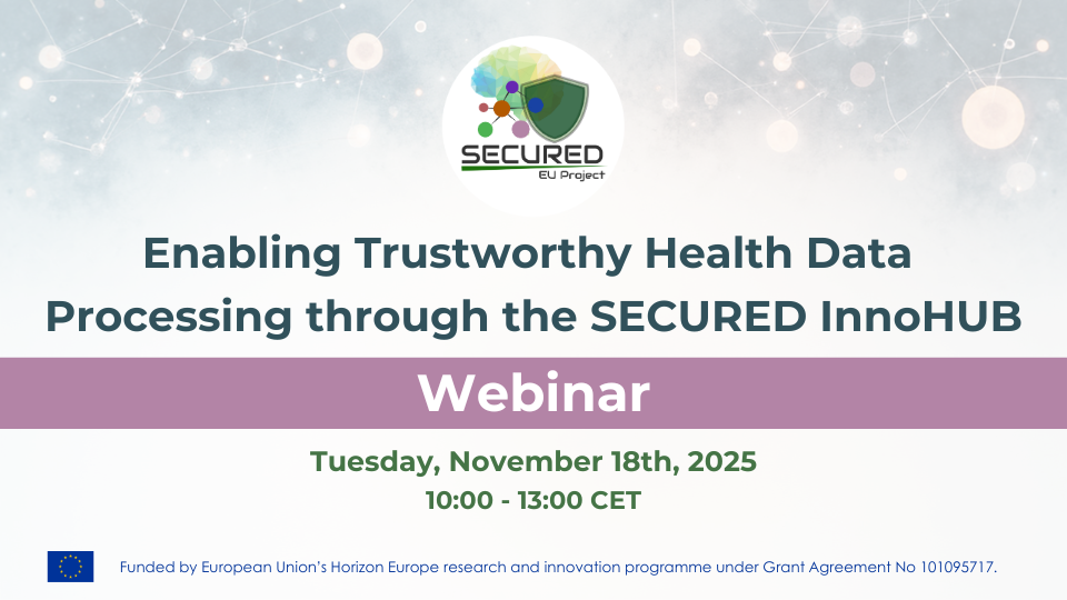 The SECURED project invites you to its second public webinar, where partners will present the technologies, tools, and services that make up the SECURED InnoHUB: a secure and collaborative environment for privacy-preserving processing and sharing of health data. This webinar will take a deeper look at how SECURED’s technologies and services can support secure research and innovation in healthcare data. Participants will gain a practical understanding of different privacy-preserving approaches, see live examples from real use cases, and learn how to access and use the InnoHUB platform. November 18th, 10:00 – 13:00 CET.